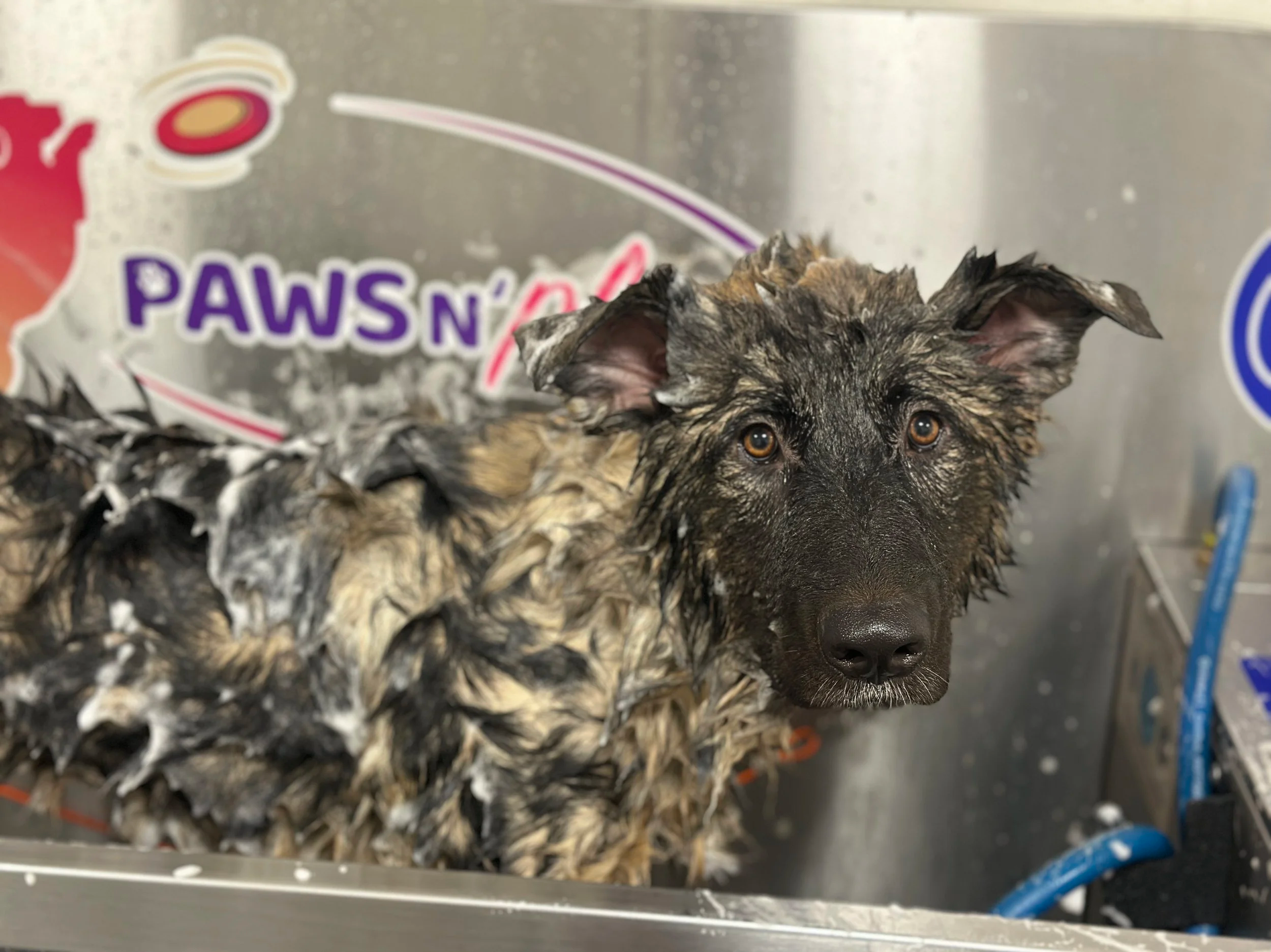 ShepHeroes brought him to Paws N’ Play for a bath—just a basic intake cleanup.